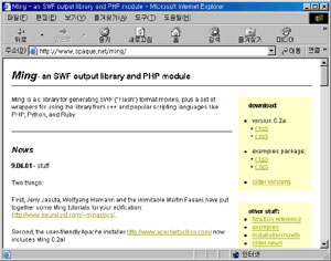 PHP에서 플래시 파일을 만들 수 있는 라이브러리에는 libswf와 ming이 있습니다. libswf는 4.0RC2이상의 버전에서, ming은 4.0.5부터 정식으로 사용할 수 있습니다. 어느 족을 사용하든 상관없겠지만 저는 다음과 같은 이유로 ming을 아용하기 결정했습니다. ◆ ming은 오픈