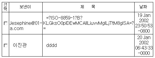 잘 만들어진 것 같지만 한글로 작성된 메일제목이 깨져서 출력된다. 이것은 아스키코드로 메일 제목이 만들어지지 않고 MiME메시지 헤더 확장을 통하여 메일 제목이 작성된 경우다.(아웃룩 등 대부분의 MTA가 MIME을 이용하여 발송하고 있다.) 이 경우 IMAP함수 중 imap_mime_header_decord함수를 이용하여 문제점을 해결할 수 있다.