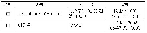 파일명 : imap_list3.html <html> <head> <title>웹메일</title> </head> <body bgcolor="white" text="black" link="blue" vlink="purple" alink="red"> <? $stream = imap_open("{localhost:143}Inbox","jklee","xxxxx"); $object_info = imap_mailboxmsginfo($stream); $mbox_record =$object_info->Nmsgs; ?> <FORM method=post> <TABLE cellSpacing=0 cellPadding=0 width="500" border=0> <TR> <TD width="500"> <TABLE cellSpacing="0" width="500" border="1" bordercolordark="white" bordercolorlight="black"> <TR height=23> <TD align=middle width=40><font size="2">선택</font></TD> <TD align=middle width=180><font size="2">보낸이 </font></TD> <TD align=middle><font size="2">제 목 </font></TD> <TD align=middle width=150><font size="2">날짜 </font></TD> <? for($msgno=$mbox_record; $msgno > 0; $msgno--) { $object = imap_header($stream, $msgno); ?> <TR> <TD align=middle><INPUT type=checkbox value=27 name=check[]></TD> <TD align=left> <?echo $object->fromaddress;?></TD> <TD align=left> <? $mbox_subject = imap_mime_header_decode($object->subject); echo $mbox_subject[0]->text; ?></TD> <TD align=middle><?echo $object->date;?></TD> </TR> <? } ?>